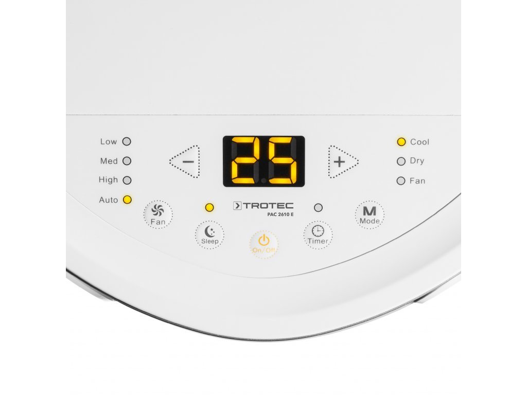 Trotec PAC 2610 E ponúka chladiaci výkon 9000 Btu/h a ochladí tak miestnosti do 34 m2 (85 m3). Prevádzková teplota je 16 – 35 °C. Pomocou úchytiek je možné ju pohodlne premiestňovať, poprípade je možné k jej transportu využiť pojazdné kolieska. Súčasťou balenia je aj diaľkové ovládanie.