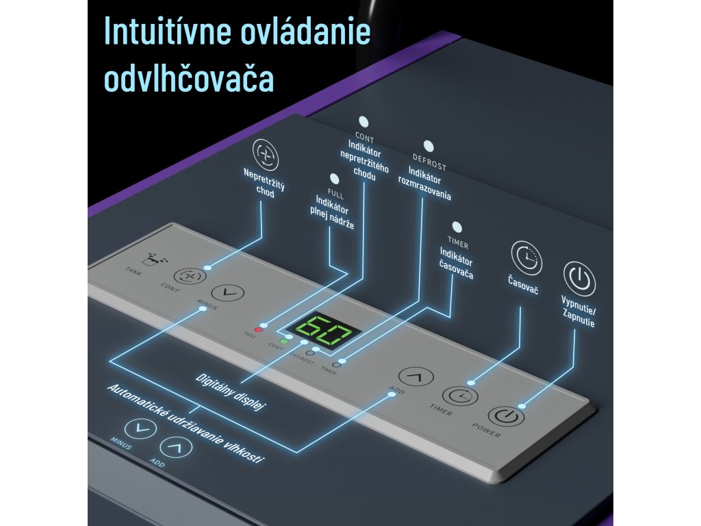 Medzi užitočné funkcie patrí nastaviteľný časovač (1–24 h) s odloženým spustením a automatickým vypnutím, vďaka čomu môžete zariadenie nechať bežať alebo ho zapnúť neskôr, bez toho aby ste sa museli obávať, keď nemôžete byť prítomní. Zariadenie je tiež vybavené hygrostatom, ktorý zabezpečuje automatické udržiavanie vlhkosti v rozmedzí 20 % – 95 %. Požadovanú vlhkosť môžete ľahko nastaviť na intuitívnom displeji, ktorý vám ukazuje aktuálnu hodnotu vlhkosti v miestnosti.
