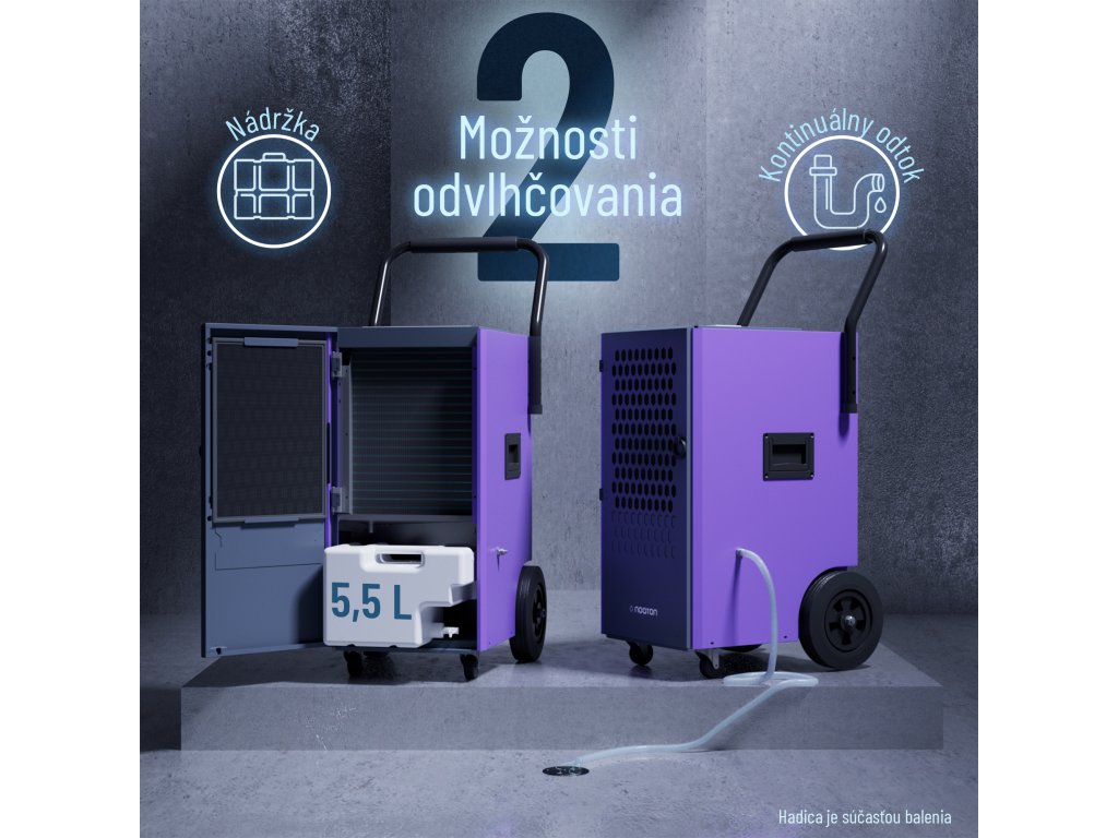 Vyberte si medzi dvoma možnosťami použitia nášho odvlhčovača Noaton DF 4150. Prvou možnosťou je 5,5 litrová nádrž, ktorú jednoducho vyprázdnite, keď je plná, a pokračujte v odvlhčovaní – prístroj sa automaticky vypne, keď je nádrž plná. Ak uprednostňujete nepretržitú prevádzku, oceníte možnosť nepretržitého odvodu vody pomocou priloženej hadice, vďaka ktorej môžete odvlhčovač nechať bežať tak dlho, ako chcete.