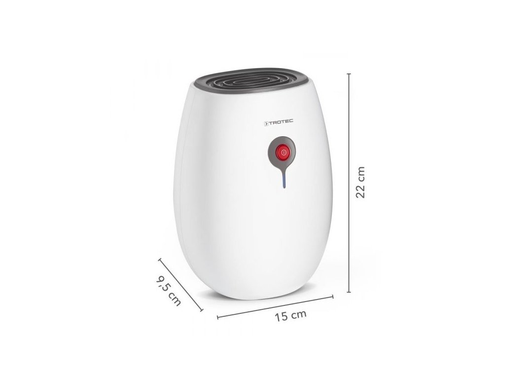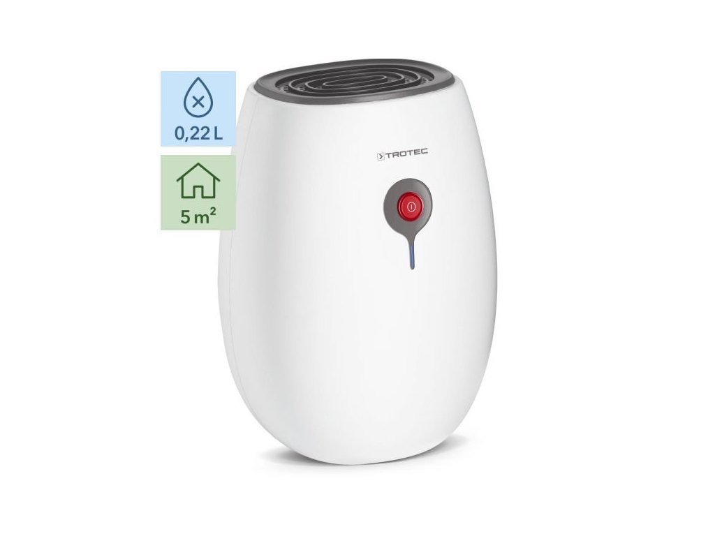 Prístroj Trotec TTP 2 E pracuje s odvlhčovacím výkonom 220 ml/24 h. Odvlhčí tak miestnosti s veľkosťou až 5 m2. Nádržku o objemu 500 ml nie je nutné vylievať každou chvíli a so spotrebou max. 22 W sa nemusíte báť vysokých účtov za elektrinu.