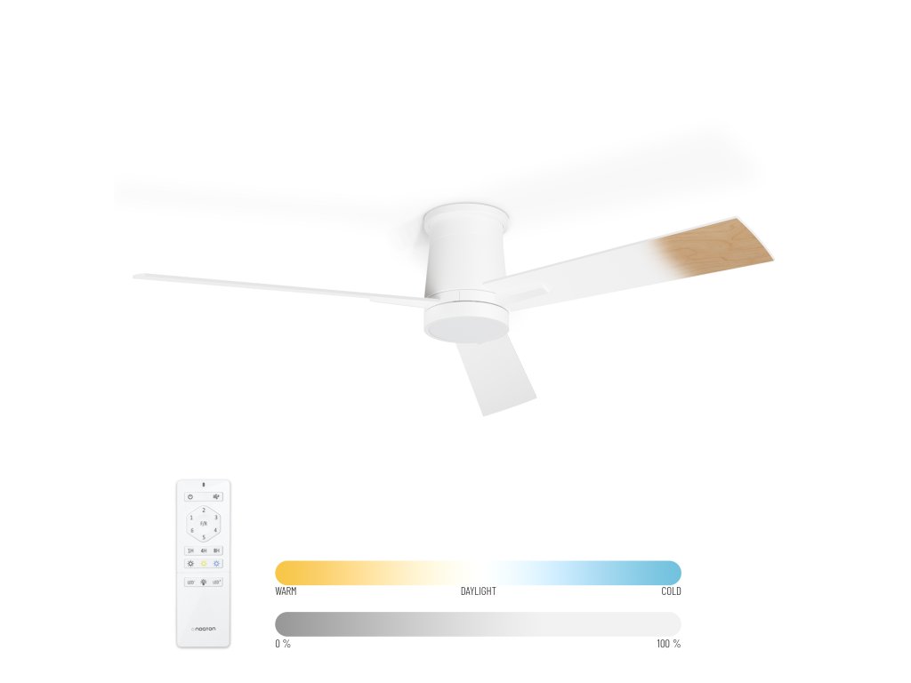 S našim ventilátorom sa nemusíte uspokojiť iba s jedným farebným prevedením. Rhea ponúka dvojfarebné riešenie vďaka obojstranným lopatkám. Môžete si vybrať medzi preferenciou bielej klasiky alebo elegantného svetlého dreva, a vybrať takú kombináciu, ktorá bude ladil práve s vašim interiérom.