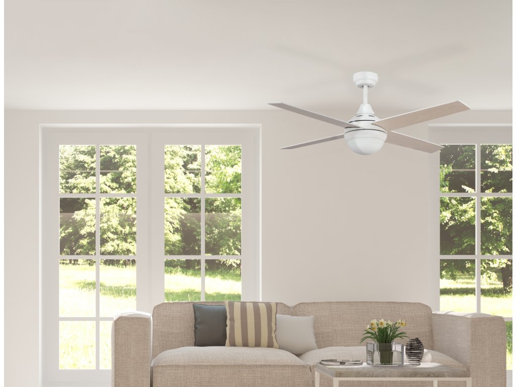 Stropný ventilátor Sulion 072144 Mara s obojstrannými lopatkami vo farbách biela a svetlo hnedá. Lopatky sa dajú otočiť ktoroukoľvek stranou dole a je možné tak vytvoriť 2 farebné kombinácie. Teleso je z kovu a má bielu farbu. Osvetlenie zaisťuje 2 svetelný zdroje E27 o sile 40W (nie je v balení). Je vhodný pre miestnosti o veľkosti 14 - 20 m2. Reverzné lopatky umožňujú otepľovanie miestnosti v zime - zimný (spätný) chod stropného ventilátora tlačí teplý vzduch od stropu dole. Ventilátor je možné namontovať s tyčou a taktiež na ľahko šikmý strop.
